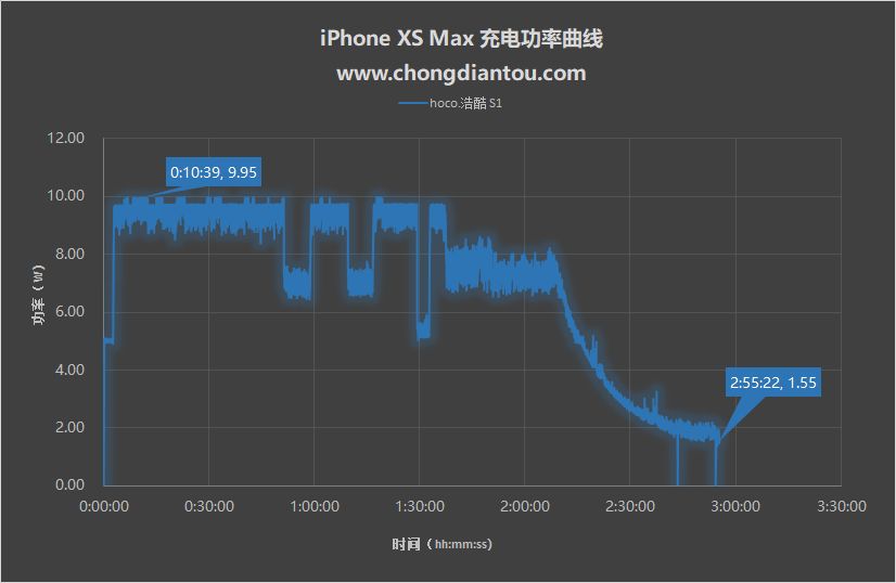 接着把iPhone XS Max的电量耗尽至自动关机,模拟在车内使用环境,用浩酷S1对其充电,测得0%~100%的充电曲线。iPhone XS Max全程充电最高功率约10W,大功率充电持续时间也比较长,全程耗时2小时55分。