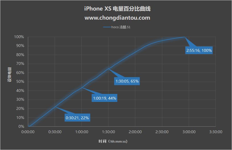 电量方面,半小时充了22%,一小时充了44%,2小时55分钟充满,作为无线充电器来说,浩酷S1充电速度十分快。