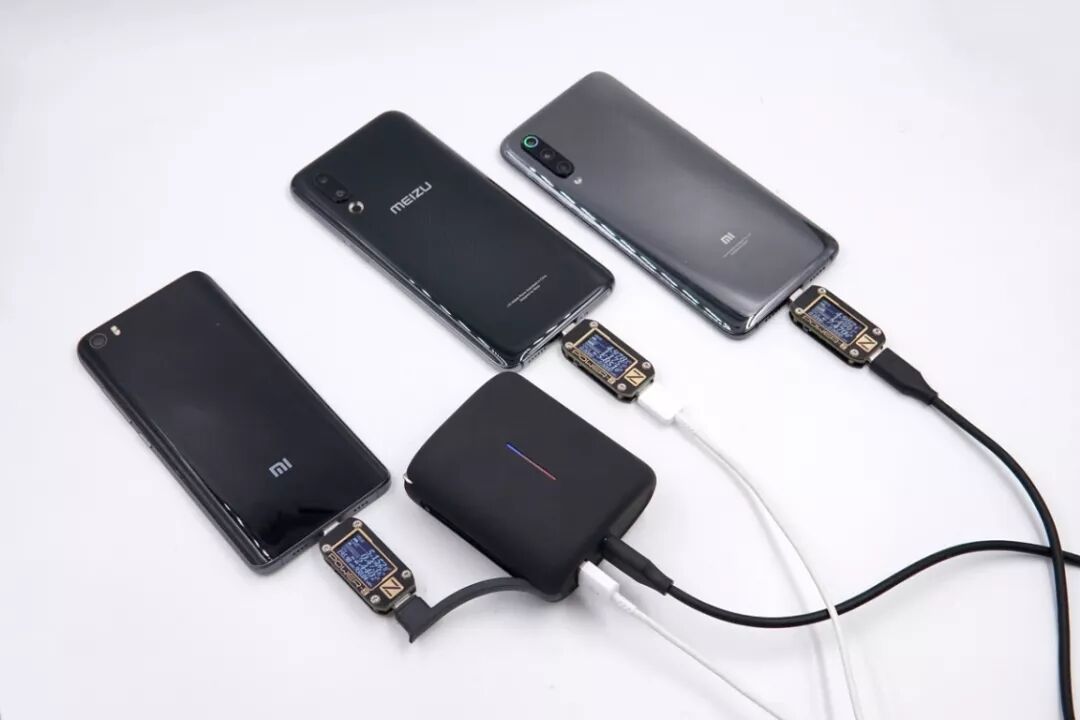不仅如此,这三个输出接口还可以同时输出。上图分别同时给小米9、魅族16S、小米5手机充电,功率分别为7.47W、5.85W、2.44W。