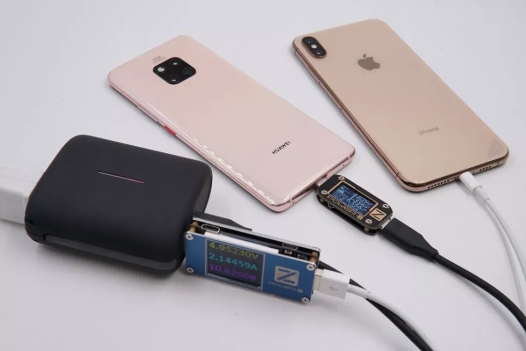 给自身充电同时它的USB-A、USB-C输出接口分别给华为Mate 20 Pro、iPhone XS Max充电,当前的输出功率为6.56W、10.62W,其中iPhone XS Max开启了Apple 2.4A协议充电。