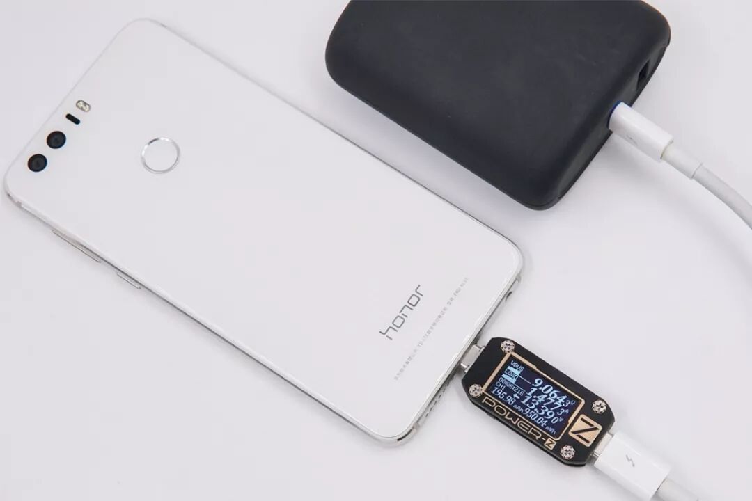 USB-C口给荣耀8充电,电压9.06V,电流1.47A,功率13.39W,开启FCP快充。