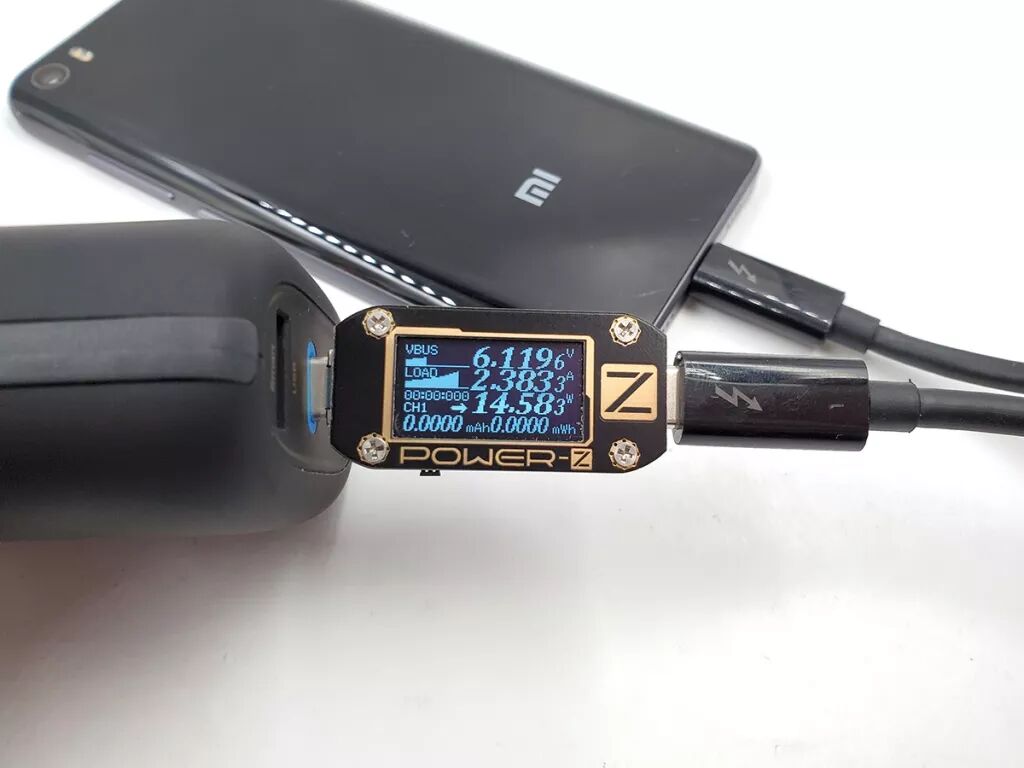 USB-C口给小米5充电,电压6.11V,电流2.38A,功率14.58W,开启QC3.0快充。
