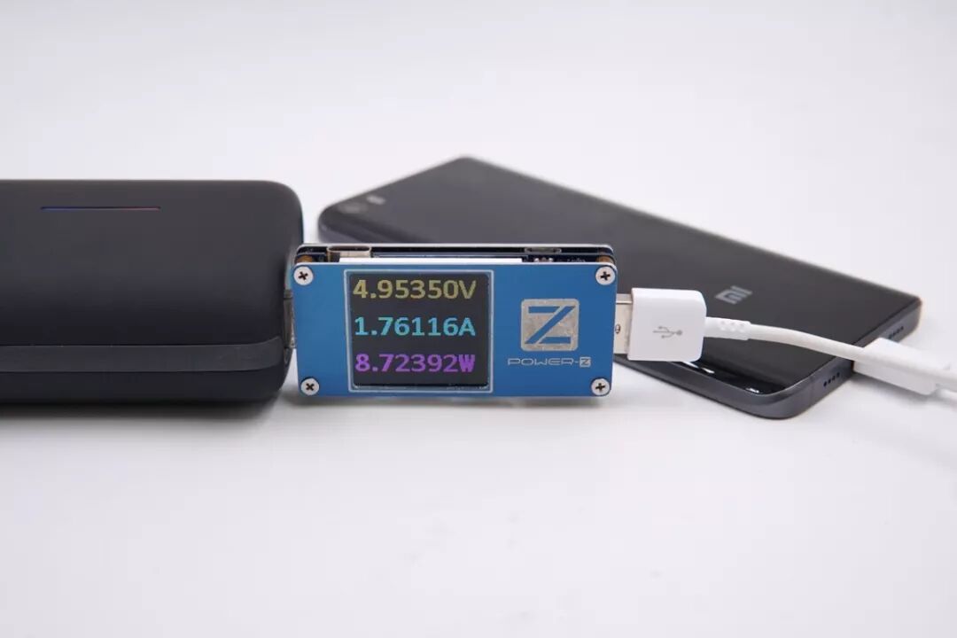 USB-A口给小米5充电,电压4.95V,电流1.76A,功率8.72W,普通充电模式。
