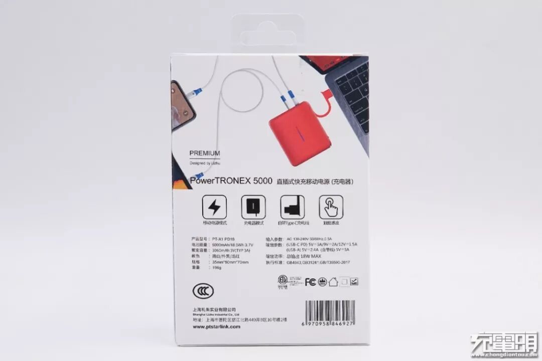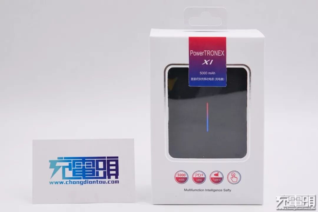 百达星连P.T STARLINK POWER TRONEX 5000直插式快充移动电源(下文简称为百达星连三合一移动电源)包装采用开窗式纸盒,一眼可以看到产品本身和它独特的电源显示条,顶部有透明挂钩方便线下售卖的展示。包装盒整体为白色,品牌标识与产品特色图标使用跟电源指示条一样的红蓝渐变色。包装盒橱窗下罗列了4个产品特点:5000mAh容量电池、PD18W快充、自带USB-C输出接头,触控按键。