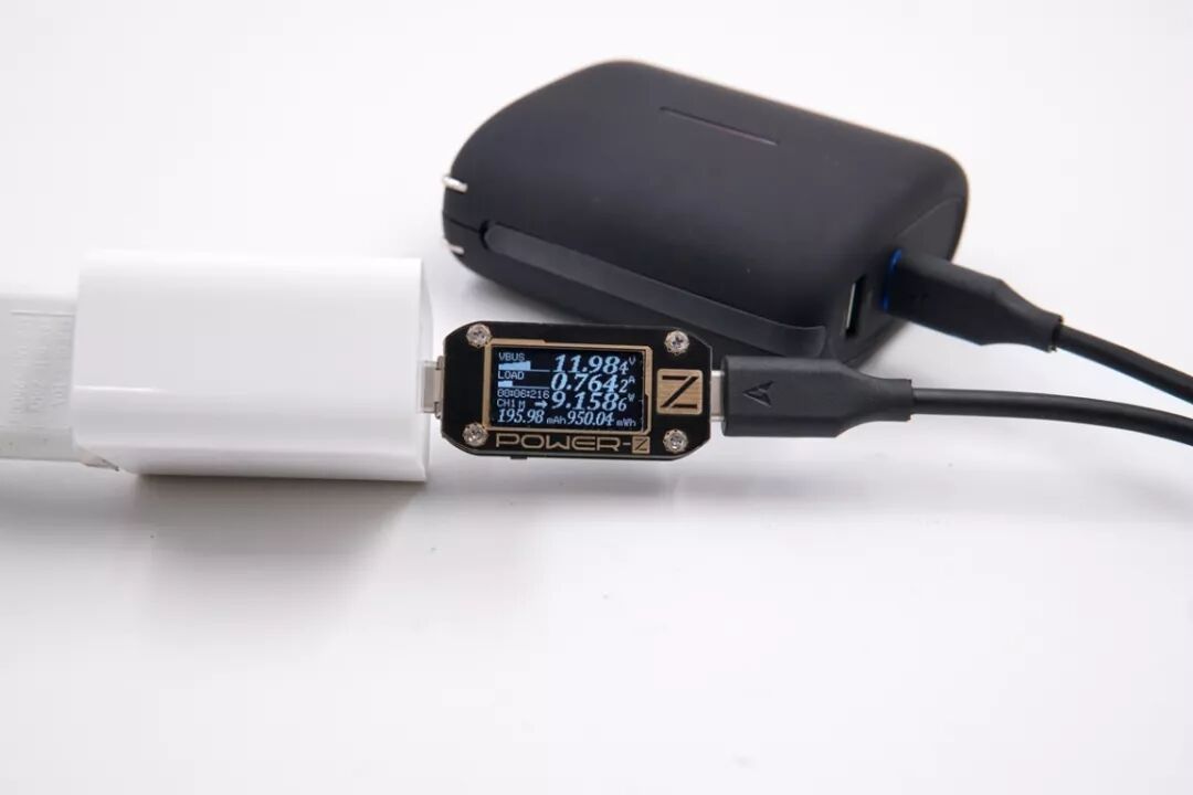 使用小米1A1C PD充电器的USB-C口充百达星连三合一移动电源,电压11.98VA,电流0.76A,功率9.15W,开启PD充电。