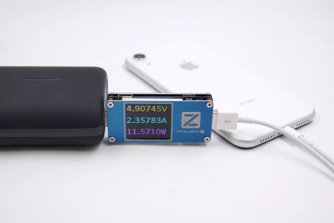 USB-A口给iPhone XR充电,电压4.9V,电流2.35A,功率11.57W,开启Apple 2.4A协议充电模式。