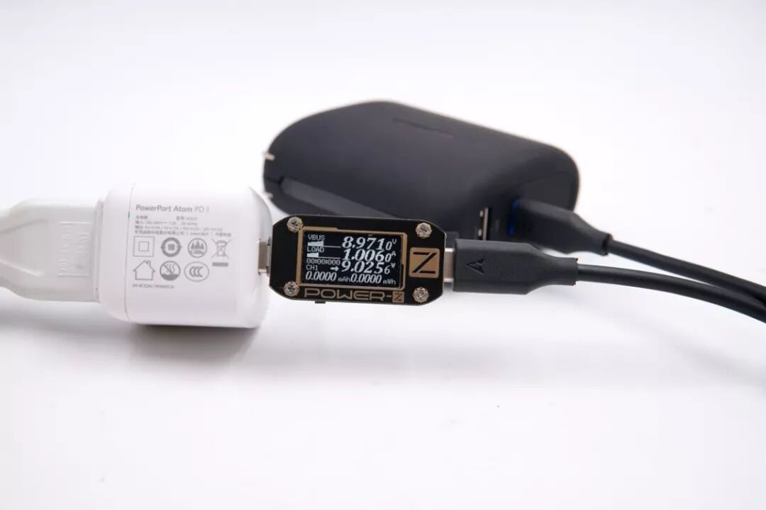 使用ANKER 30W PD充电器充百达星连三合一移动电源,电压8.97V,电流1A,功率9.02W,开启PD充电。