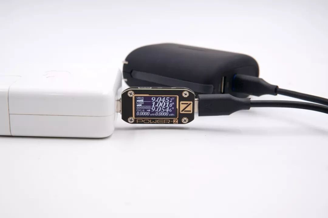 使用苹果61W PD充电器充百达星连三合一移动电源,电压9.04V,电流1A,功率9.05W,开启PD充电。