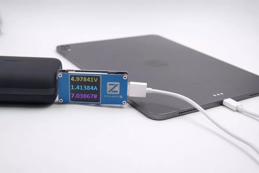 因为iPad Pro 11英寸平板不支持Apple 2.4A协议,在使用百达星连三合一移动电源的USB-A口给它充电时,电压4.97V,电流1.41A,功率7.03W,为普通充电模式。