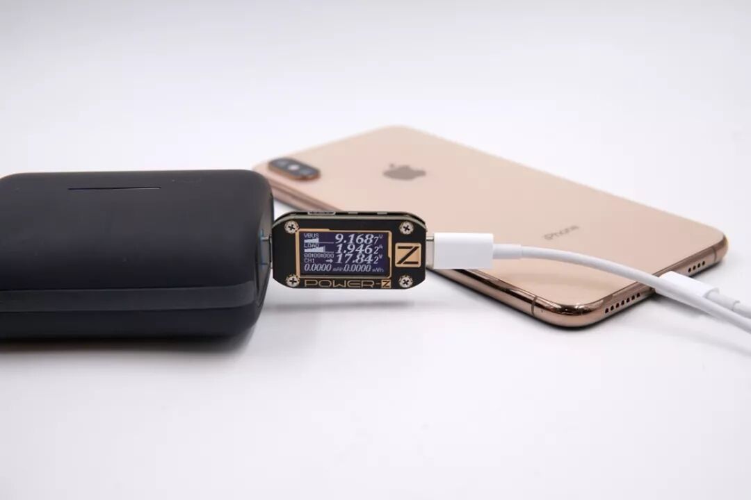 使用百达星连三合一移动电源的USB-C口给iPhone XS Max充电,电压9.16V,电流1.94A,功率17.84W,开启PD快充。