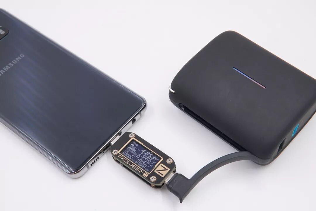 百达星连三合一移动电源的自带线USB-C口给三星S10+充电,电压4.85V,电流1.98A,功率9.64W,普通充电模式。