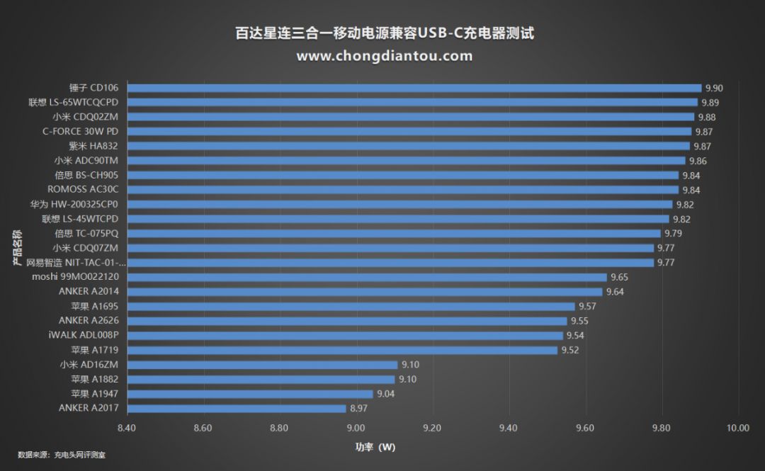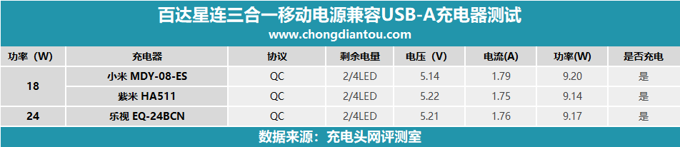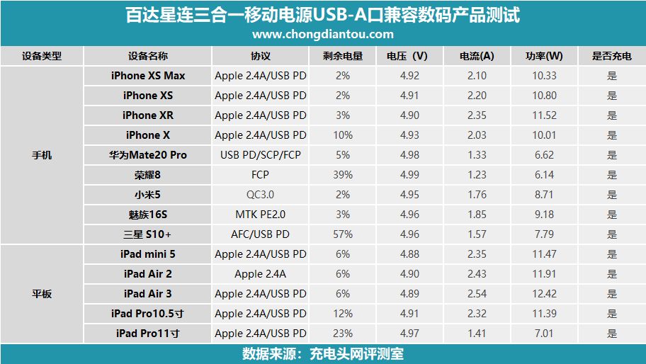 小编还测试了一些其他的PD充电器,数据做成了表格,方便大家观看。百达星连三合一移动电源USB-C口支持PD充电,功率基本在10W左右。