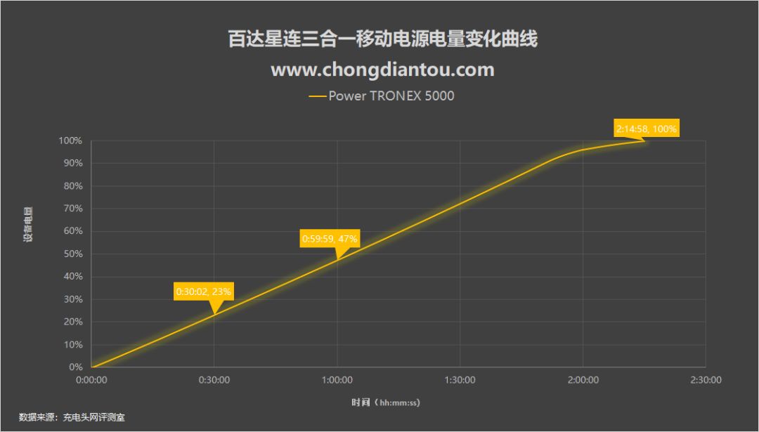 接着是电量变化方面,从上图可知百达星连三合一移动电源使用自带AC插脚充电时,半小时可充23%电量,1小时可充47%,全程耗时2小时14分。