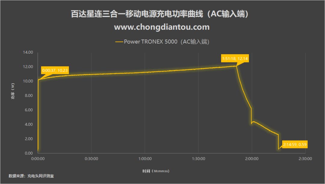 上图为功率曲线图,首先要注意的是该功率为百达星连三合一移动电源 AC插脚输入端功率。从图中可以看出,充电一开启功率便达到了10.23W并且持续上升,在充电1小时51分钟时达到最高功率12.14W并开始下落,最后在2小时14分充电完成。