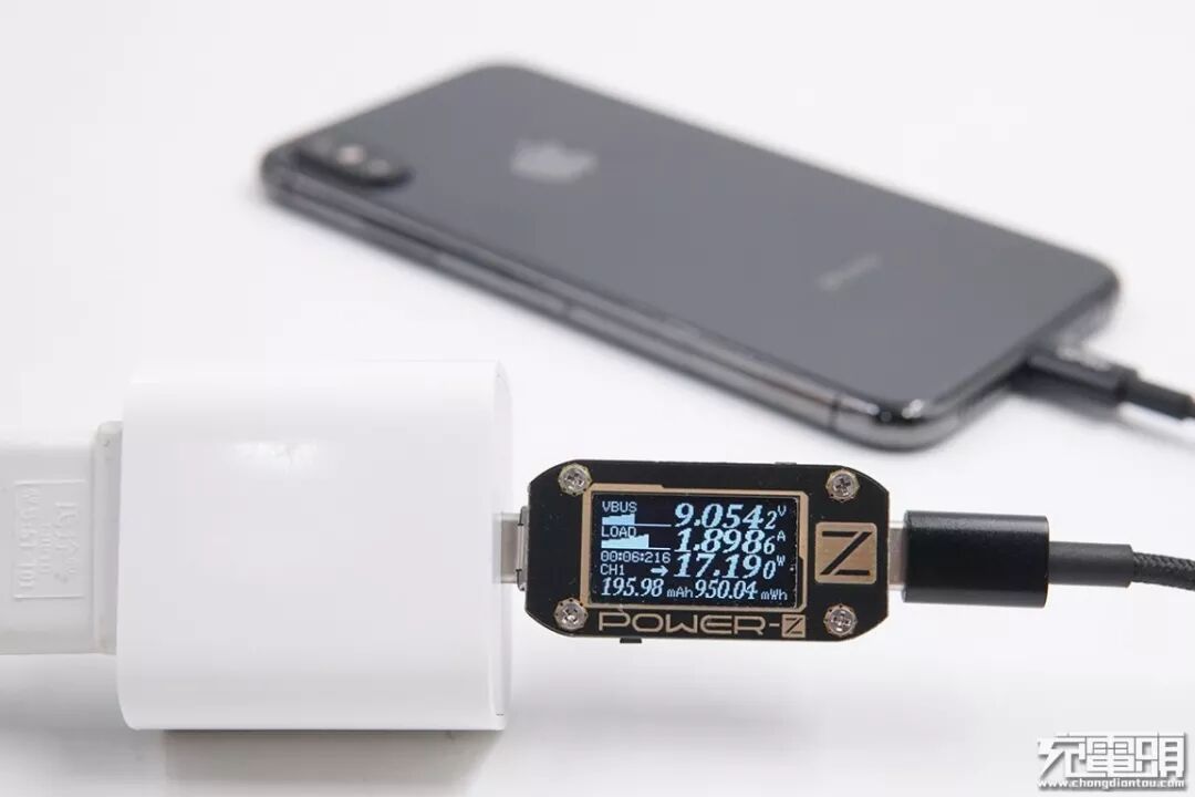 使用OPSO USB-C to Lightning数据线+苹果18W PD充电器给iPhone XS充电,电压9.05V,电流1.89A,功率17.19W,开启PD快充。