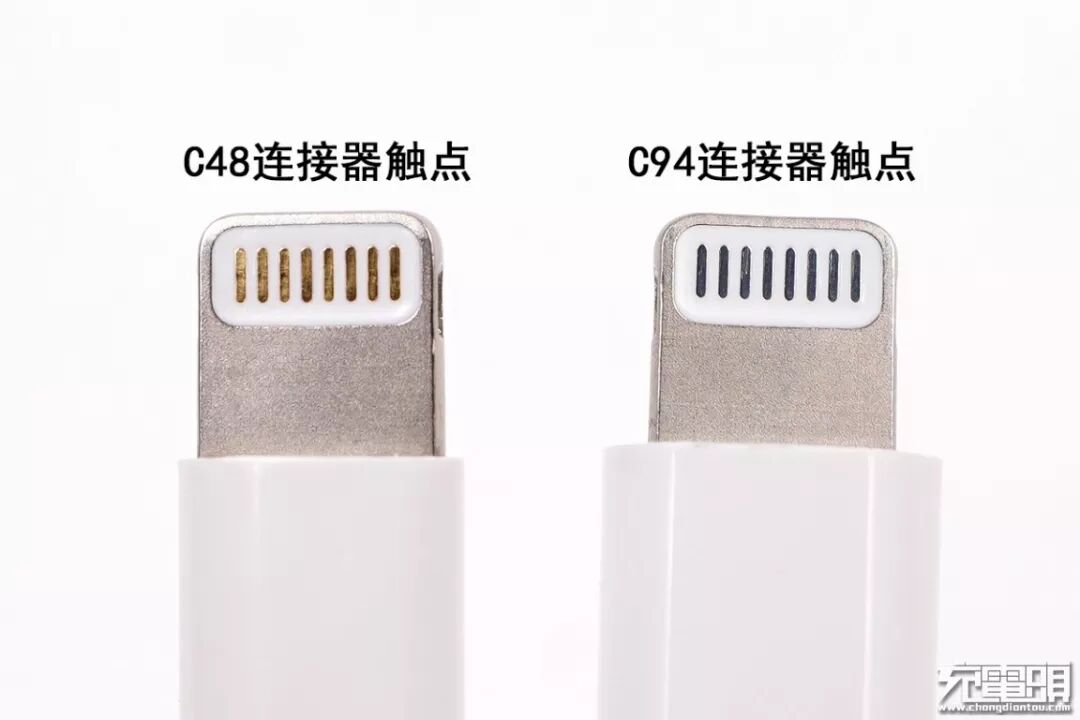Lightning端印有OPSO字样,针脚为银色,连接器的电镀工艺从镀金升级为更昂贵耐用的镀铑钌(lǎo liǎo),符合C94端子特征。
