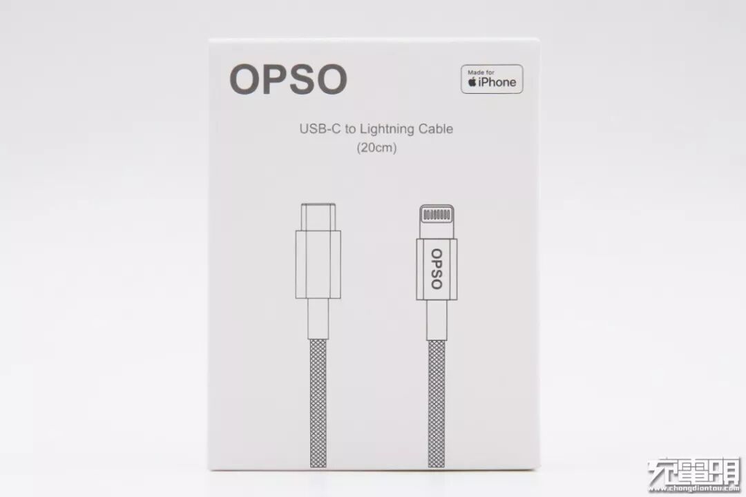 包装盒正面使用工程图刻画线材的外形,图案上部写明产品名称:USB-C to Lightning Cable (20cm),这是国内首家开售的超短C94线材。左上角是OPSO的商标,右上角为MFi认证标识。