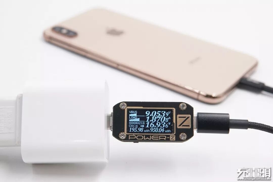 使用OPSO USB-C to Lightning数据线+苹果18W PD充电器给iPhone XS Max充电,电压9.05V,电流1.87A,功率16.93W,开启PD快充。