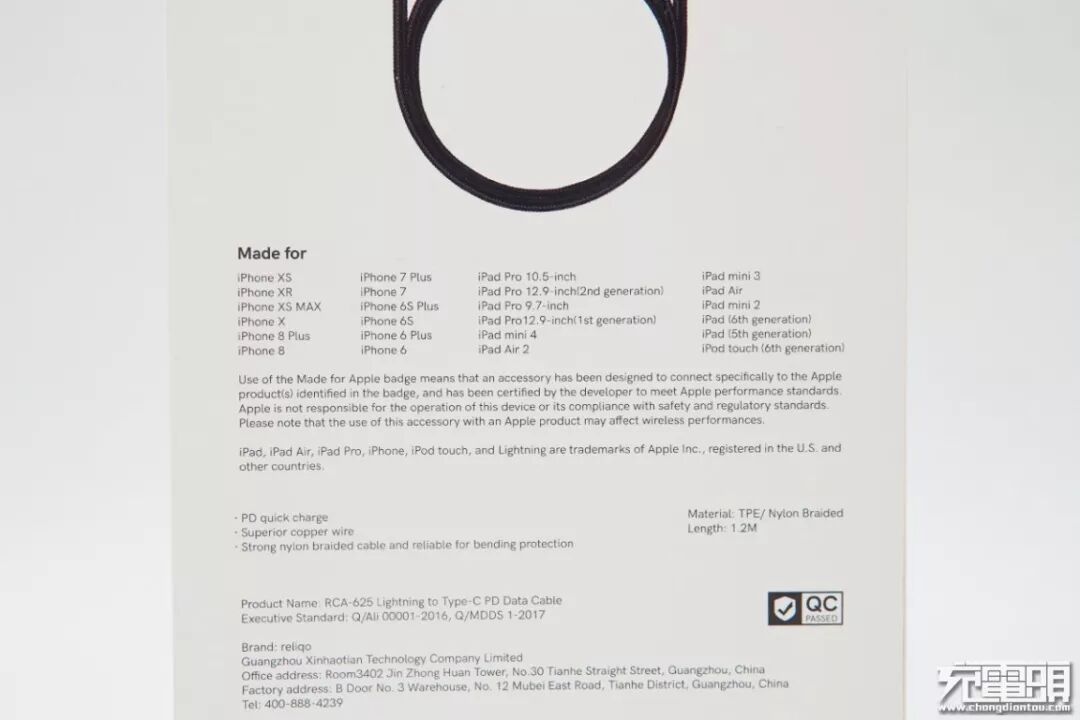 盒子背面是兼容性列表、MFi认证介绍、生产制造信息等。该数据线产品型号为:RCA-625,生产日期为2019年4月。