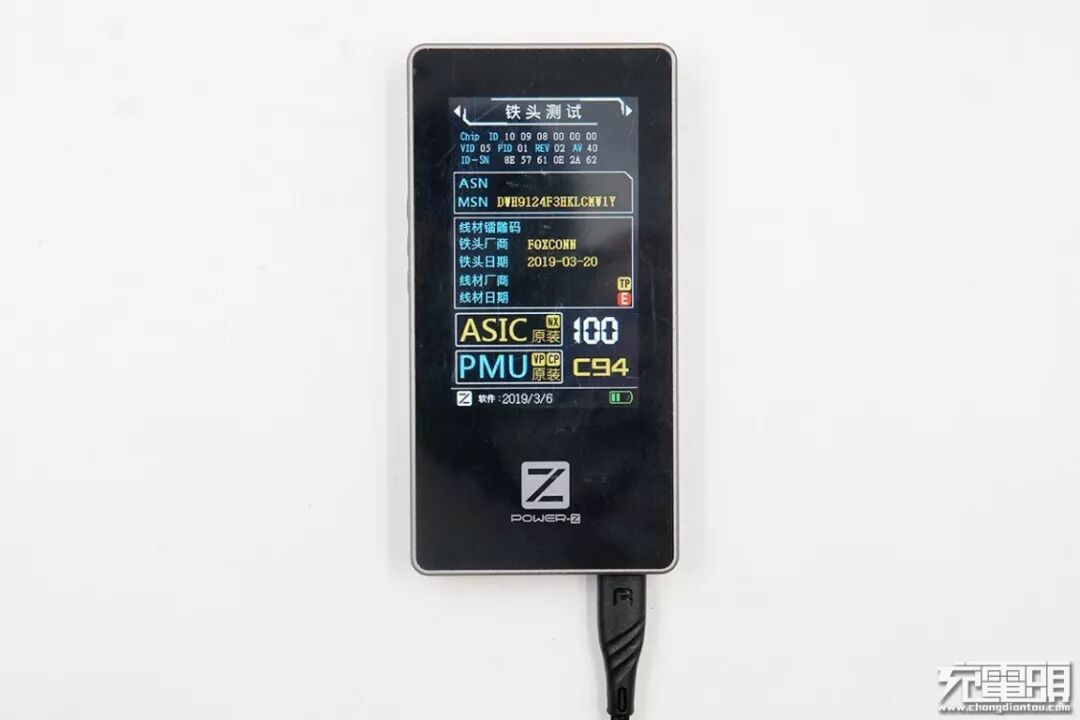 对于reliqo USB-C to Lightning编织线的Lightning端子测试,小编使用的是ChargerLAB Power-Z MF001测试仪。从测试仪的屏幕中可以看到,该款数据线ASIC、PMU均为原装C94元件,评分为100分。