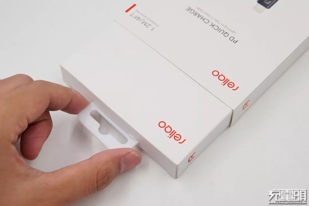 reliqo USB-C to Lightning编织线采用抽拉式双层包装盒,盒子顶部带有挂钩。外层纸盒为白色,盒子上标注的产品名称为:PD QUICK CHARGE Lightning to Type-C Data Cable。纸盒左上角为红色“reliqo”LOGO,右上角标注数据线长度为1.2米。中央印有数据线外观图案及MFi认证标识,并有UV镀膜。