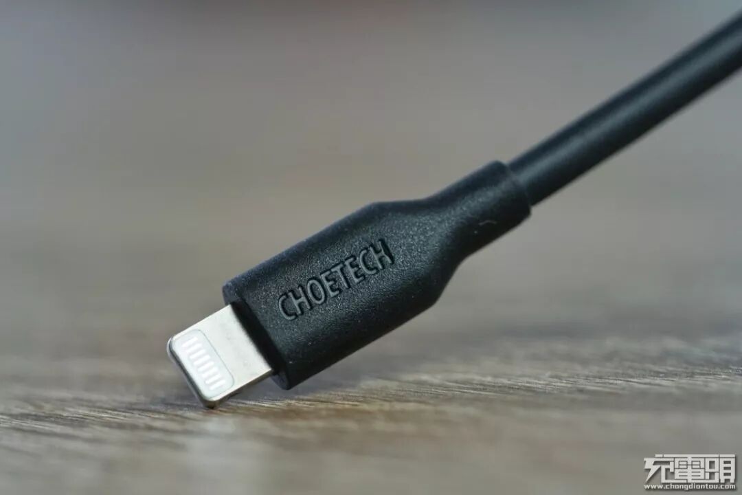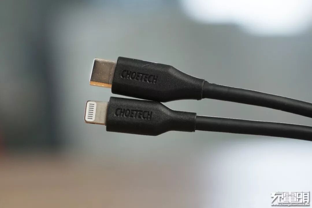 线材接口为USB-C(上方)和Lightning(下方),两端线头均为一体注塑成型,在线头与线身连接处做了加固出来。另外线头处还凹刻迪奥科品牌标识:CHOETECH。