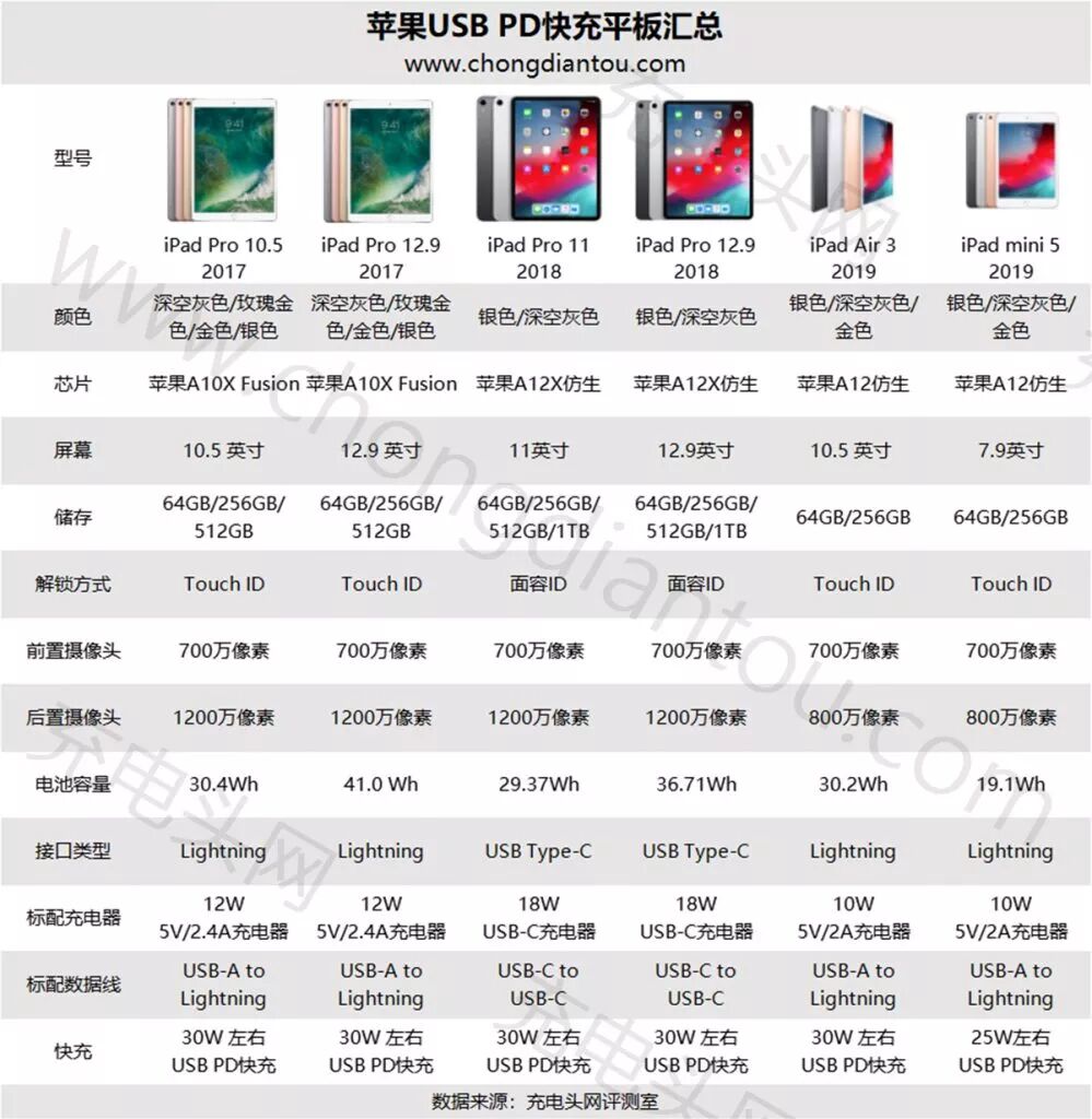 苹果支持USB PD快充的iPad型号汇总。