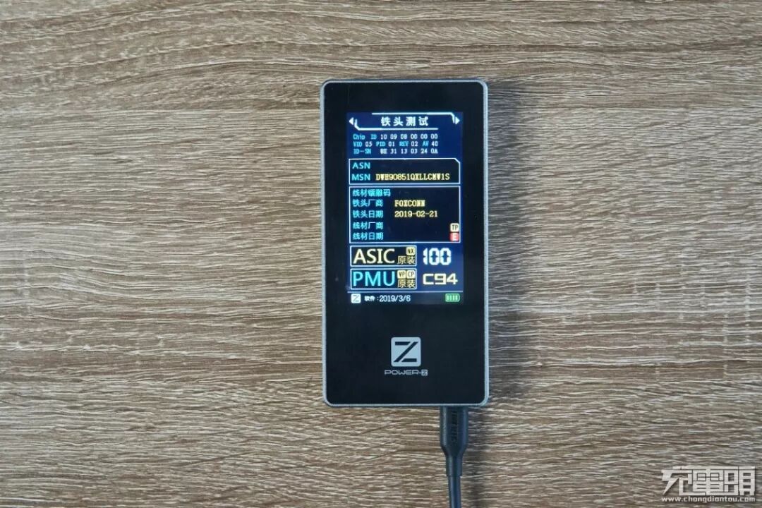 使用ChargerLAB Power-Z MF001测试仪进行Lightning端子测试,测得为端子型号为C94,ASIC、PMU均为原装,评分100分。