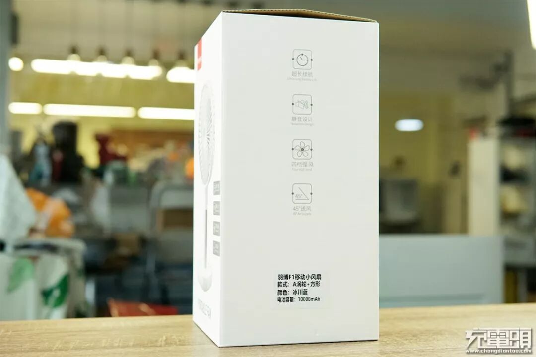 羽博PORTABLE FAN的移动小风扇F1光看包装个头还有点大。长方体的大纸盒包装,盒子正面印制风扇外观图,让人一目了然。