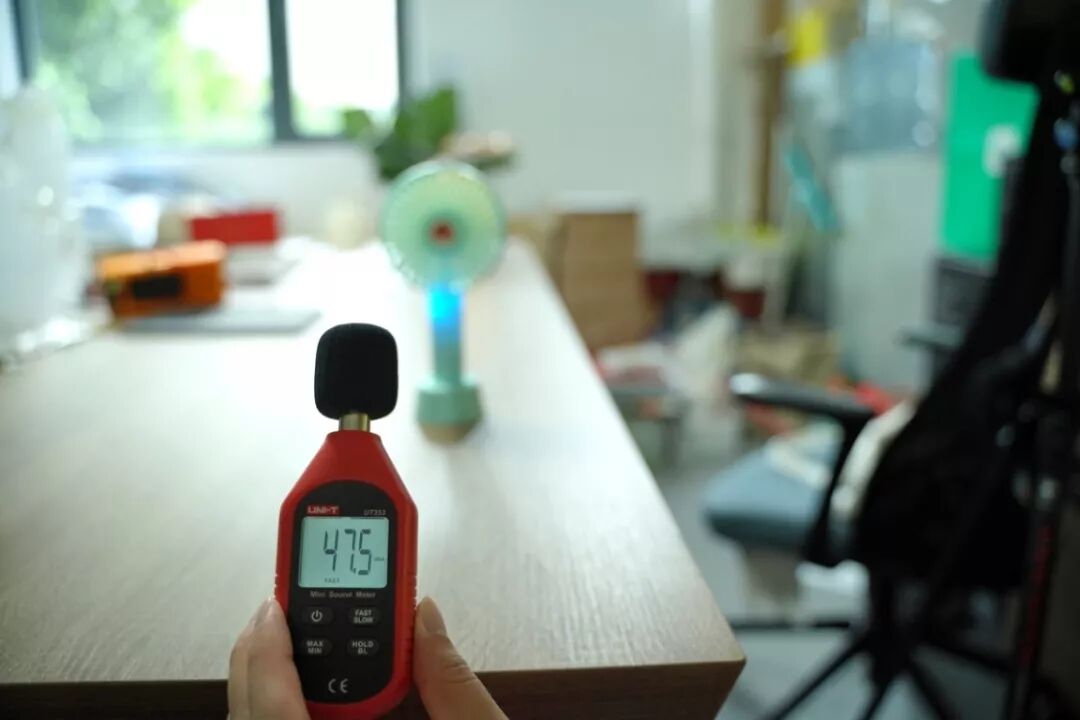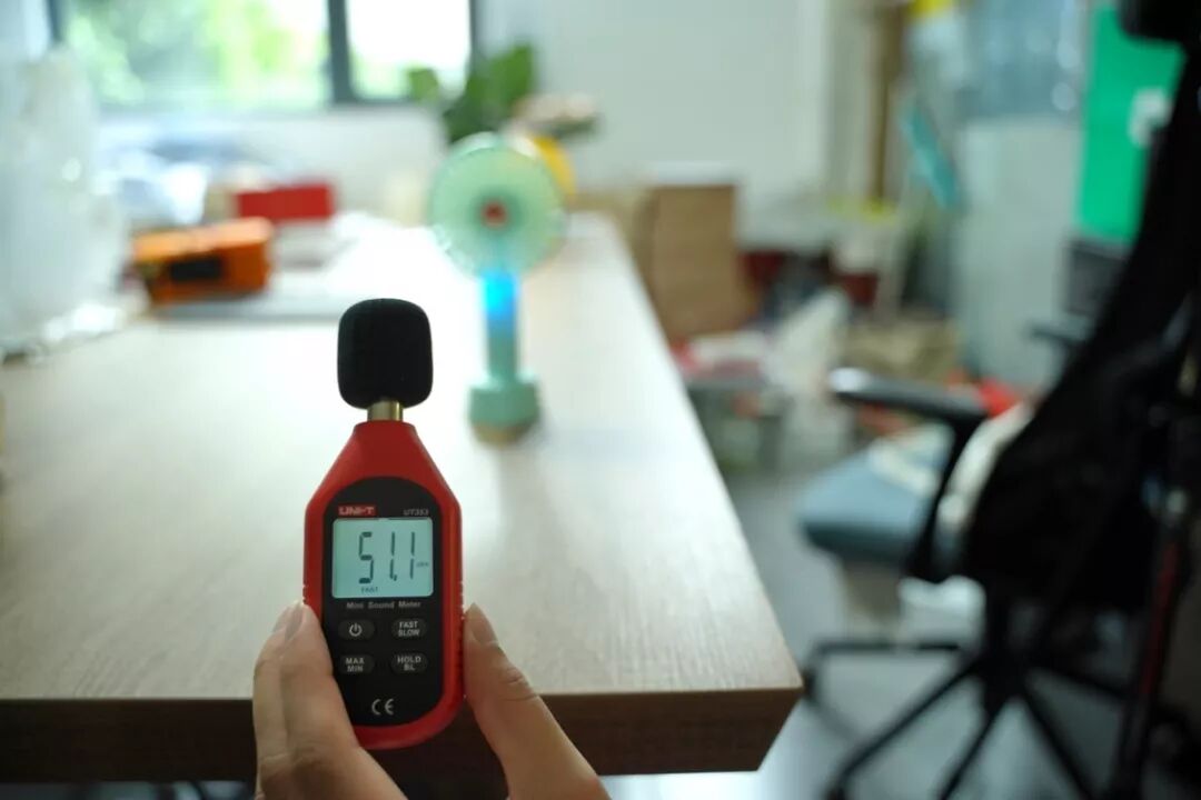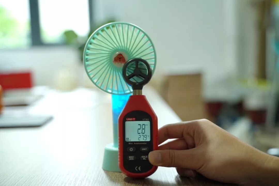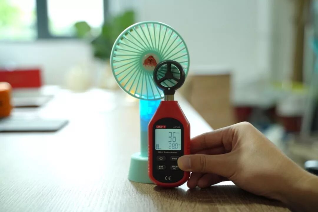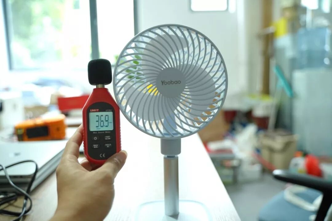 对于一款风扇来说,风速与噪音是影响体验最主要的两个因素。风速影响风力大小,吹起来凉不凉就看它;噪音影响听觉,噪音分贝到达一定的数值便是噪音,风扇带来的噪音太大将严重影响到人的使用体验。小编找来一台市面山常见的普通小风扇与之对比,首先来看下羽博PORTABLE FAN的移动小风扇F1。