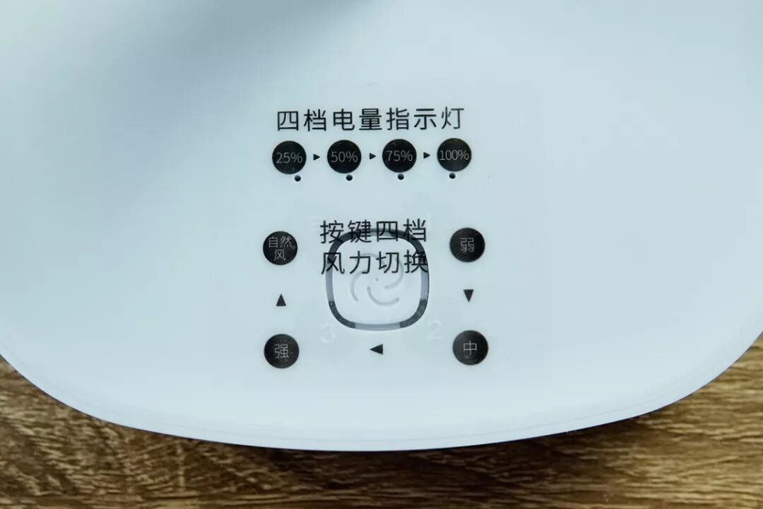 小风扇的底座上有4枚电量指示灯,每颗代表25%电量,在使用过程中会亮起。