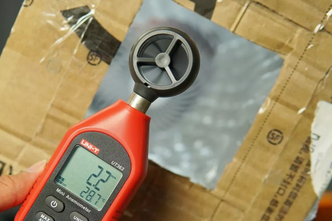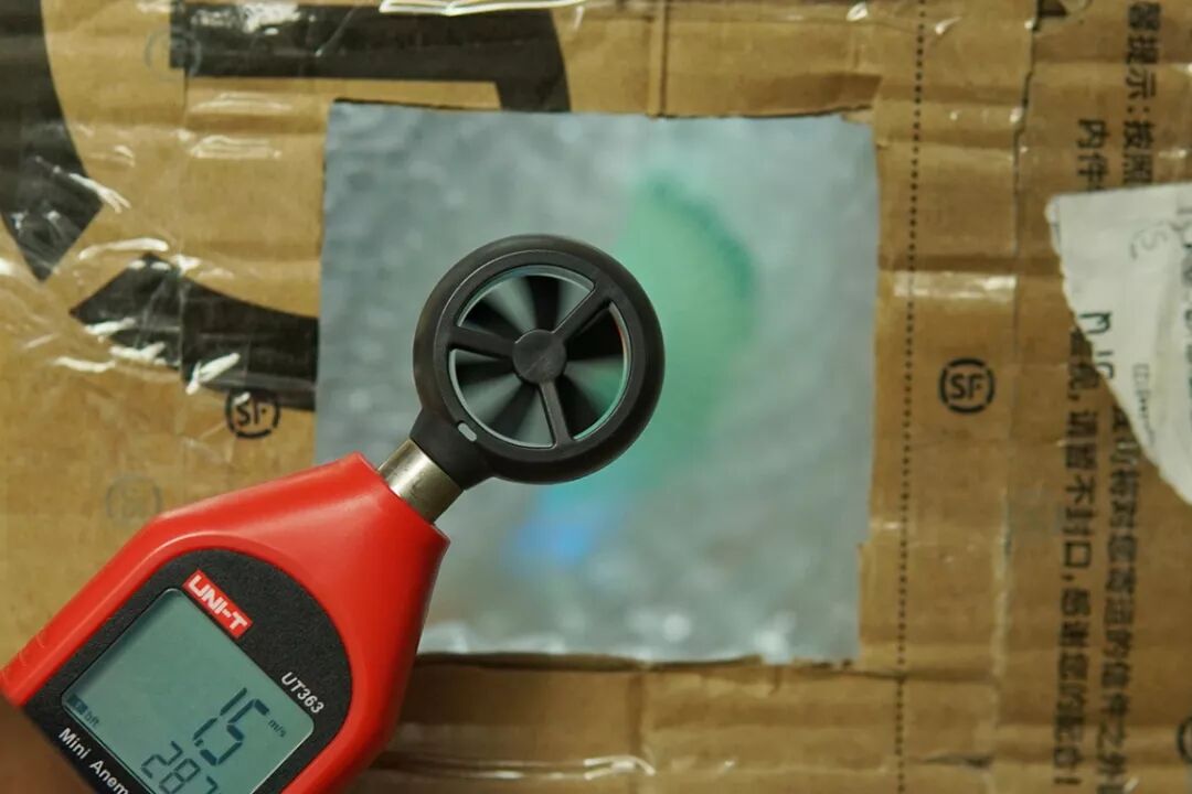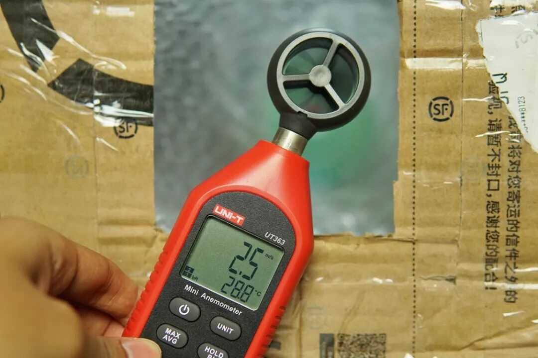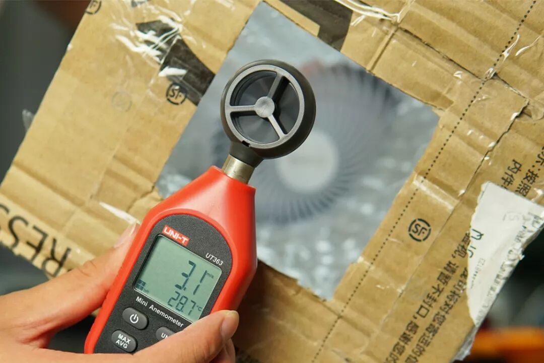 风量测试使用一个塑料袋包裹着电风扇出风口,再在塑料袋上使用模版开一个边长10cm正方形出风口,风速 x 模版出风口圆面积 = 风量。