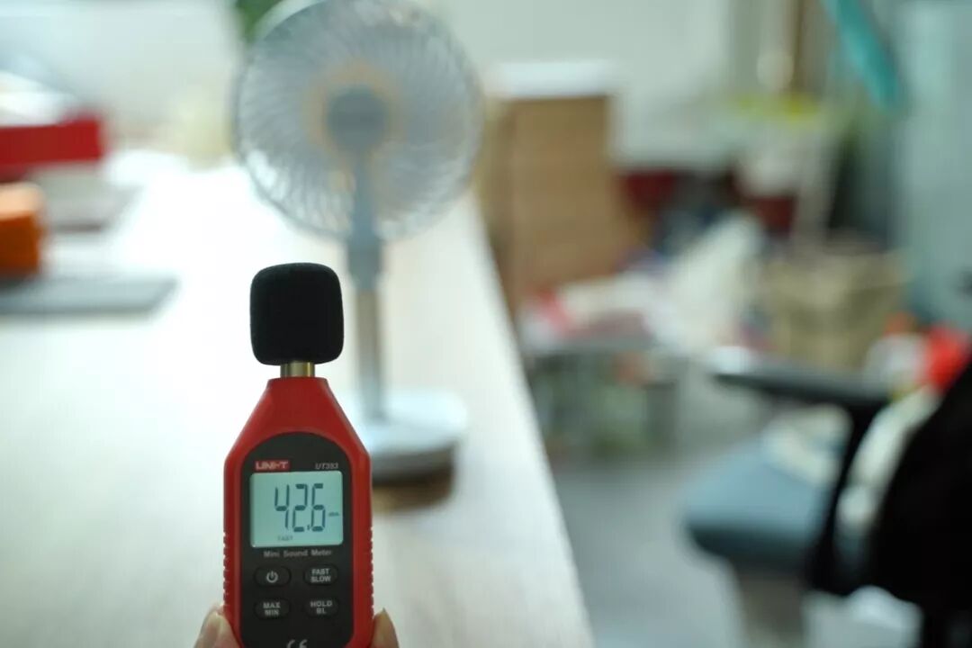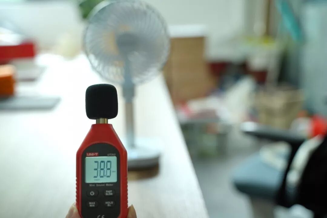 上图为测试环境噪音,为36.9dB,在开启风扇时,小编会在离风扇出风口35cm处进行噪音测试,风速测试位置则在风扇出风口,结果如下。