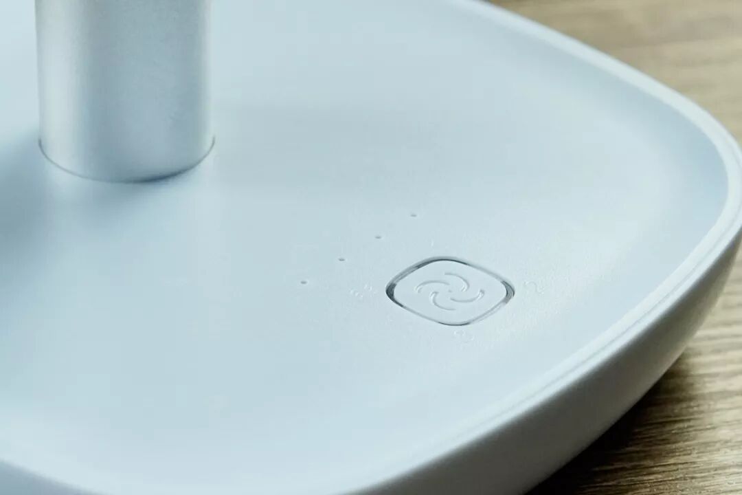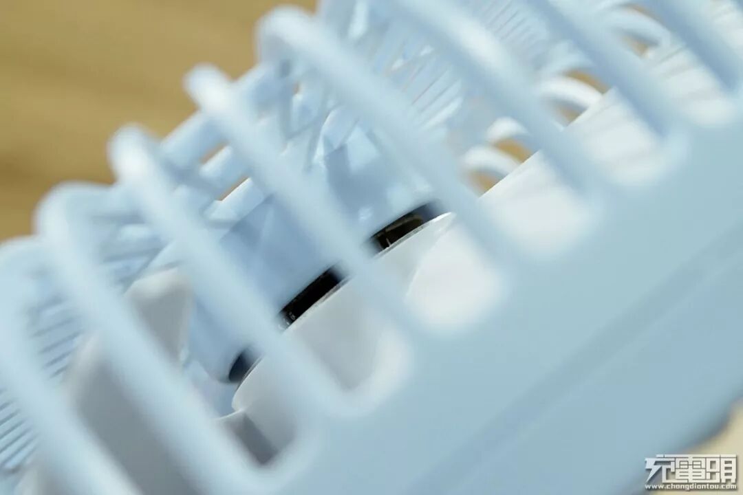 风扇的底座使用磨砂塑料材质,磨砂颗粒细腻,触感顺滑。整个面板向下凹陷,评测可以放些钥匙之类的小物件在上面。