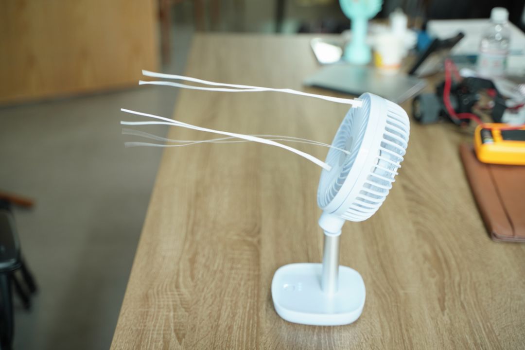 把羽博PORTABLE FAN 移动小风扇F1调至三档,烟雾被风扇所产生的风吹至3米开外。