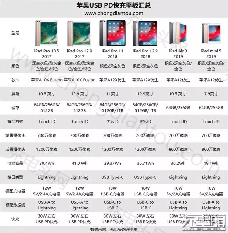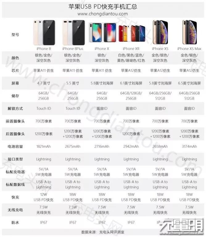 同时还需设备本身支持PD协议,以下是充电头网总结的苹果支持USB PD快充的设备汇总。