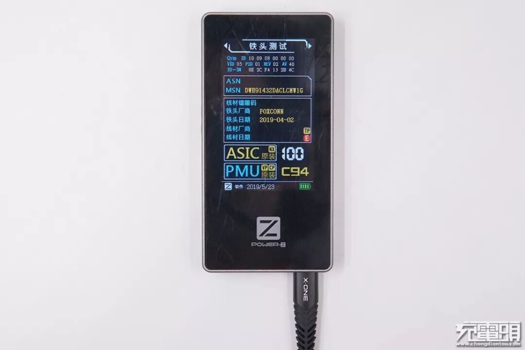 使用ChargerLAB Power-Z MF001测试仪对X·ONE USB-C to Lightning数据线端子头进行测试,从测试仪的屏幕中可以看到,该款数据线ASIC、PMU均为原装C94元件,评分为100分。