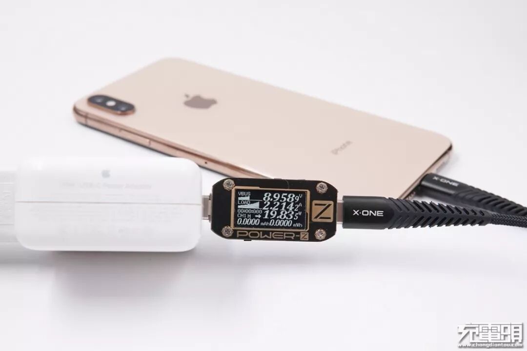 使用X·ONE USB-C to Lightning数据线+苹果30W PD充电器给iPhone XS充电,电压8.96V,电流2.03A,功率18.26W,开启PD快充。