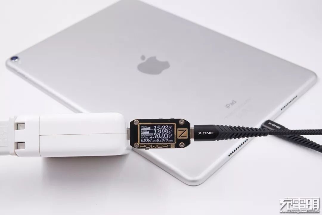 使用X·ONE USB-C to Lightning数据线+苹果61W PD充电器给iPad Pro 10.5英寸充电,电压15.02V,电流1.99A,功率30.03W,开启PD快充。