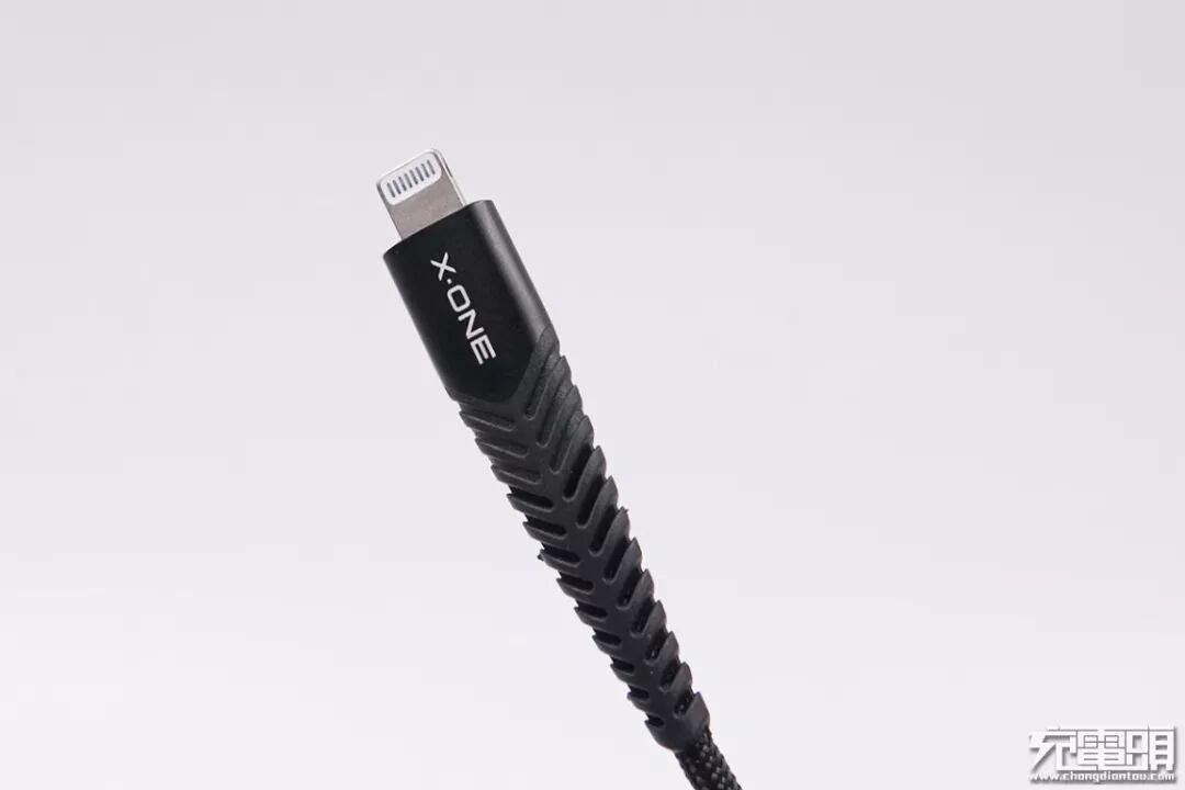 据外包装的信息来看,X·ONE USB-C to Lightning数据线的端头使用一体成型激光焊接金属头,提高保护性。端头金属外壳阳极氧化处理,并且在端头上标有X·ONE标识。