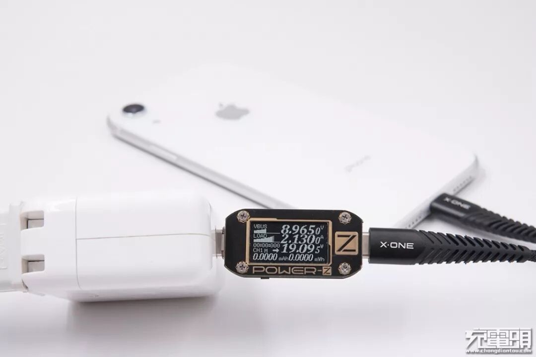 使用X·ONE USB-C to Lightning数据线+苹果30W PD充电器给iPhone XR充电,电压8.96V,电流2.13A,功率19.09W,开启PD快充。
