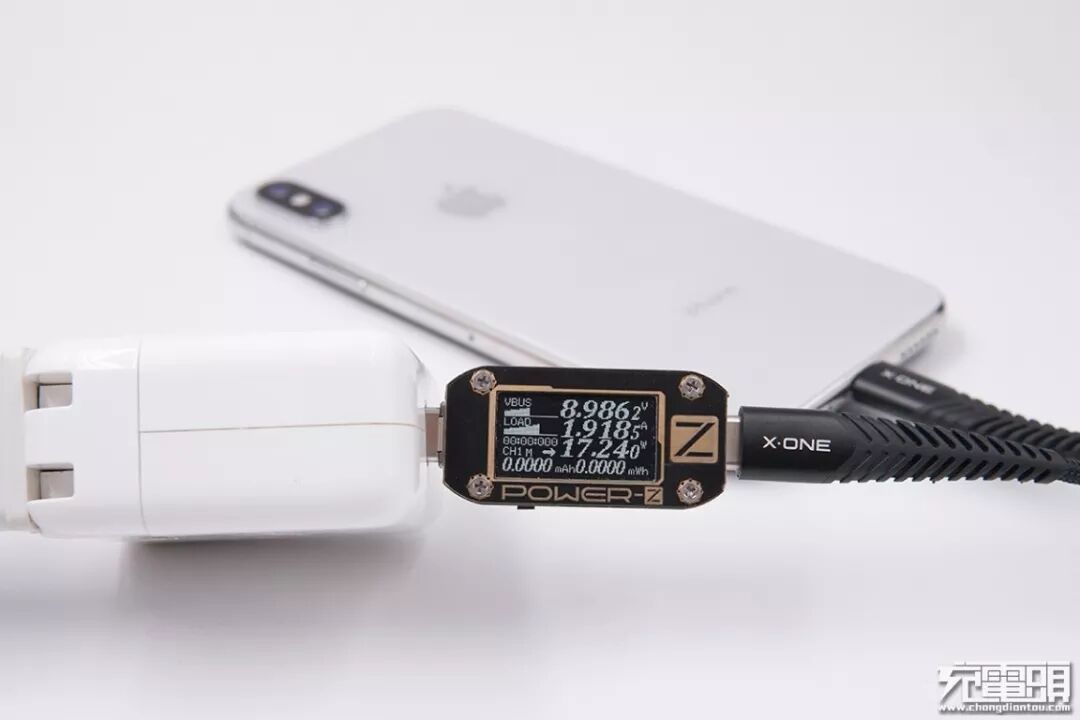 使用X·ONE USB-C to Lightning数据线+苹果30W PD充电器给iPhone X充电,电压8.98V,电流1.91A,功率17.24W,开启PD快充。