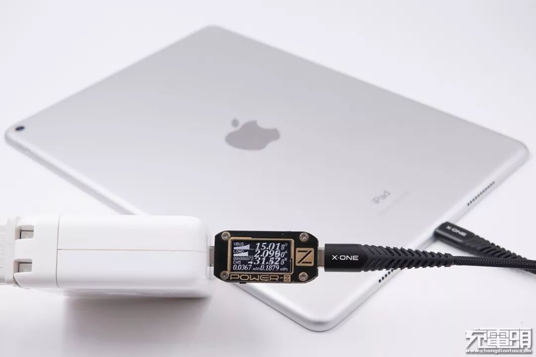 使用X·ONE USB-C to Lightning数据线+苹果61W PD充电器给iPad Air3充电,电压15.01V,电流2.09A,功率31.52W,开启PD快充。