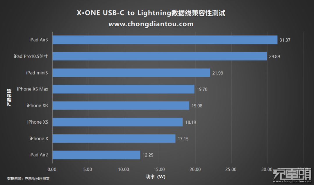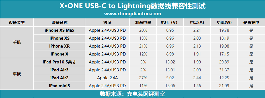 兼容性测试中,使用X·ONE USB-C to Lightning数据线+PD充电器测试了市面上一些支持PD快充且为Lightning接口的数码产品设备,兼容性良好,均能开启PD快充。所以说,无论你是用来充iPhone还是iPad它都能满足你的充电需求。