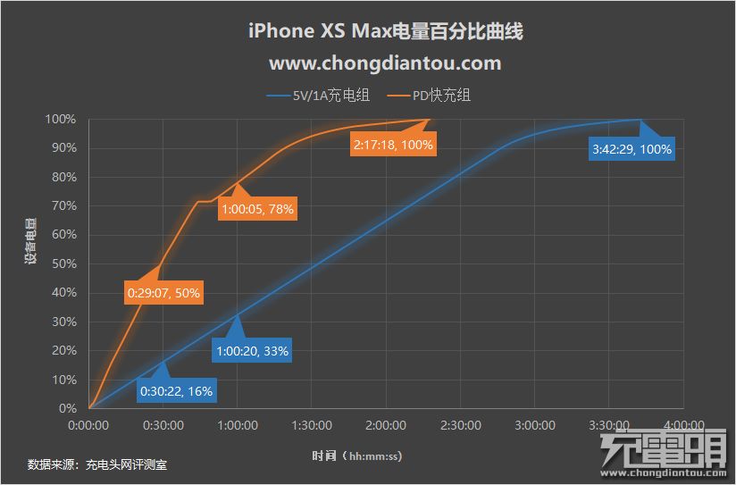 小编拿来了以前实测过的两组iPhone XS Max充电数据,PD快充组是使用PD充电器+USB-C to Lightning数据线,祖传“五福一安”组是使用iPhone XS Max标配的5W充电器+USB-A to Lightning数据线。PD快充组半小时可充进50%电量,充电速度非常快,而五福一安组半小时只充进了16%,相差甚远。