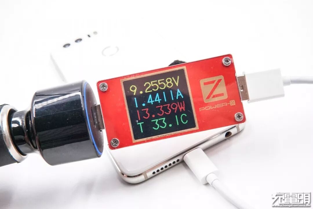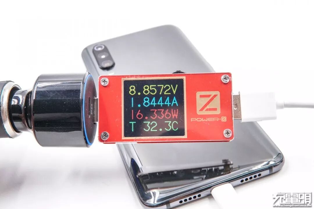 使用车充的USB-A接口对小米9进行充电,当前电压为8.85V,当前电流1.84A,功率显示16.33W,成功握手QC快充。