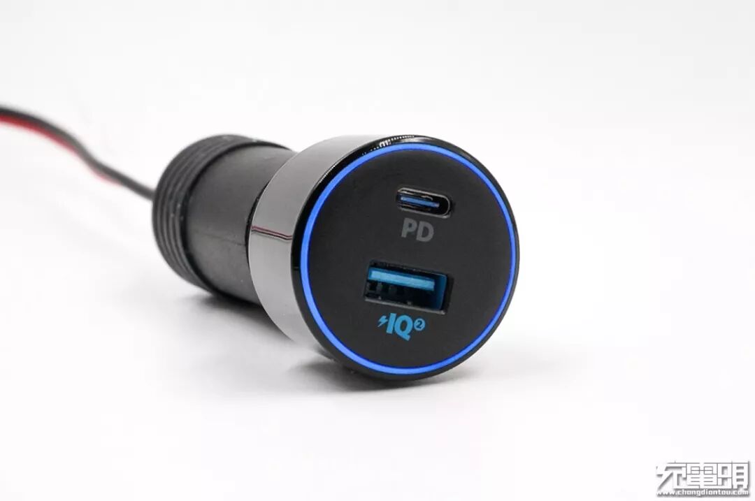 Anker PowerDrive Speed+ 2双口车充的接口面板为黑色磨砂表面,在USB-C接口下方标有PD字样USB-A接口下标有IQ2字样,两个输出接口的胶舌均为蓝色。在车充通电后,面板外围会亮起一圈蓝色指示灯,为产品增加一丝科技感。