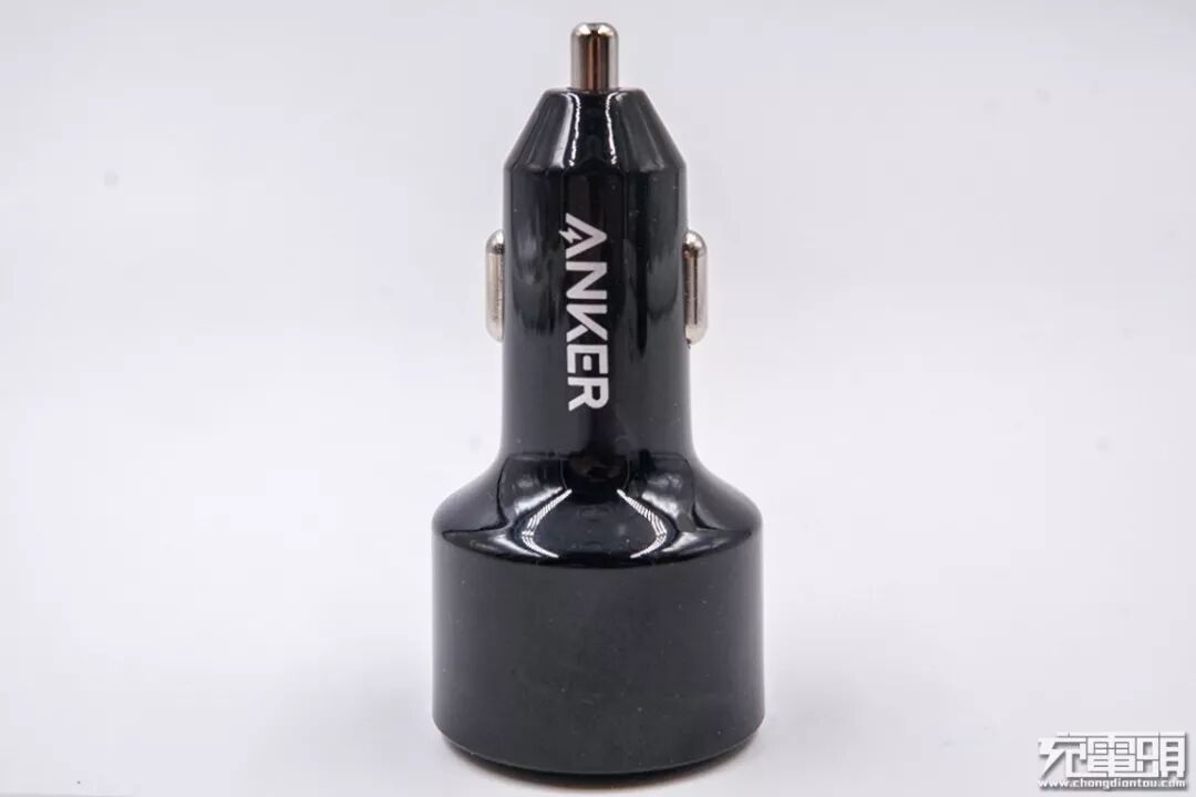 Anker PowerDrive Speed+ 2双口车充采用了“T”字型结构,头部较大,拔插时比较方便。纯黑色机身比较百搭,装配在车中不显突兀,充通电后亮起一圈蓝色指示灯,也能增加车内的氛围。
