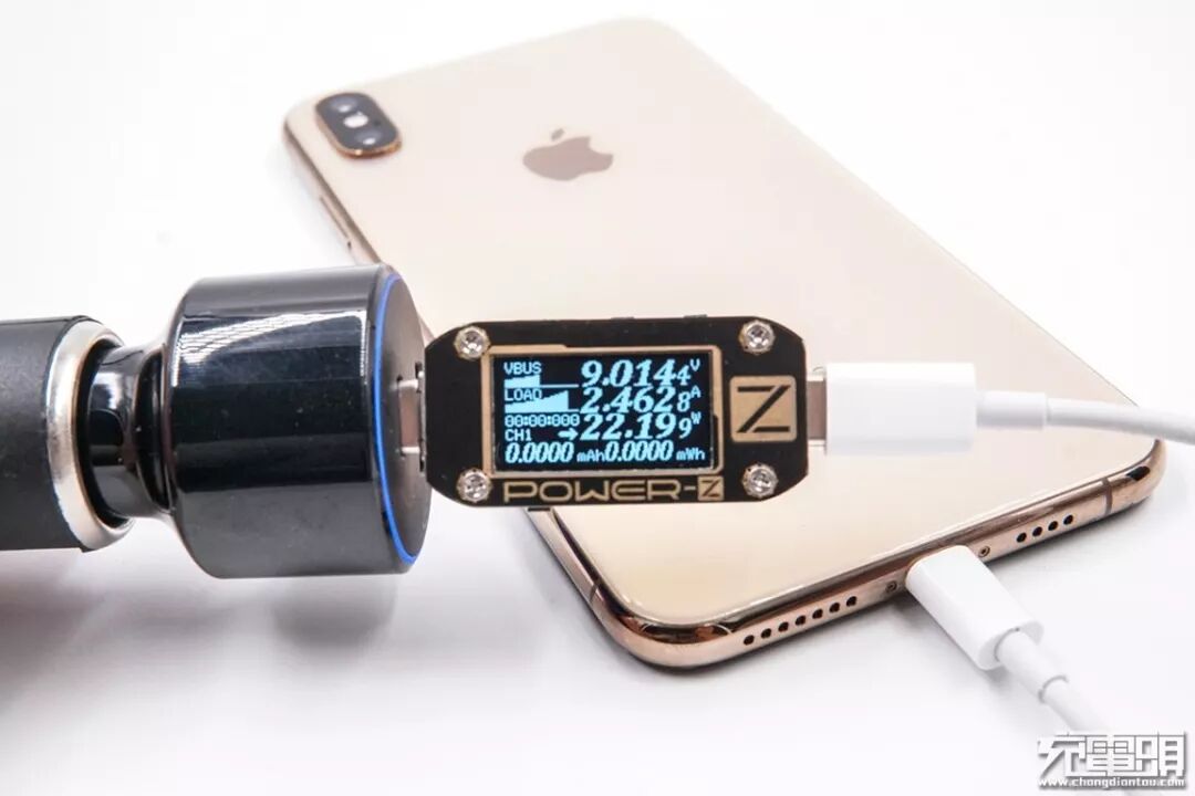 单独使用Anker PowerDrive Speed+ 2双口车充的USB-C接口对iPhone XS Max进行充电,当前电压为9.01V,当前电流2.46A,功率显示22.19W,成功开启PD快充。