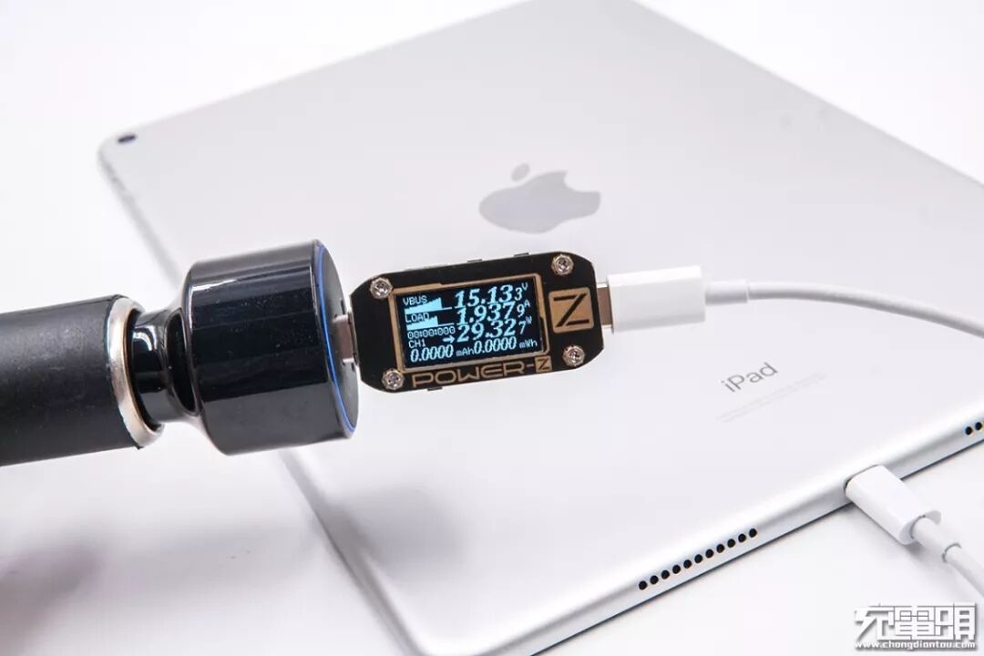 再使用这款车充的USB-C接口对iPad Air3进行充电,当前电压为15.13V,当前电流1.93A,功率显示29.32W,成功开启PD快充,达到了这款车充的USB-C接口的最大输出功率。